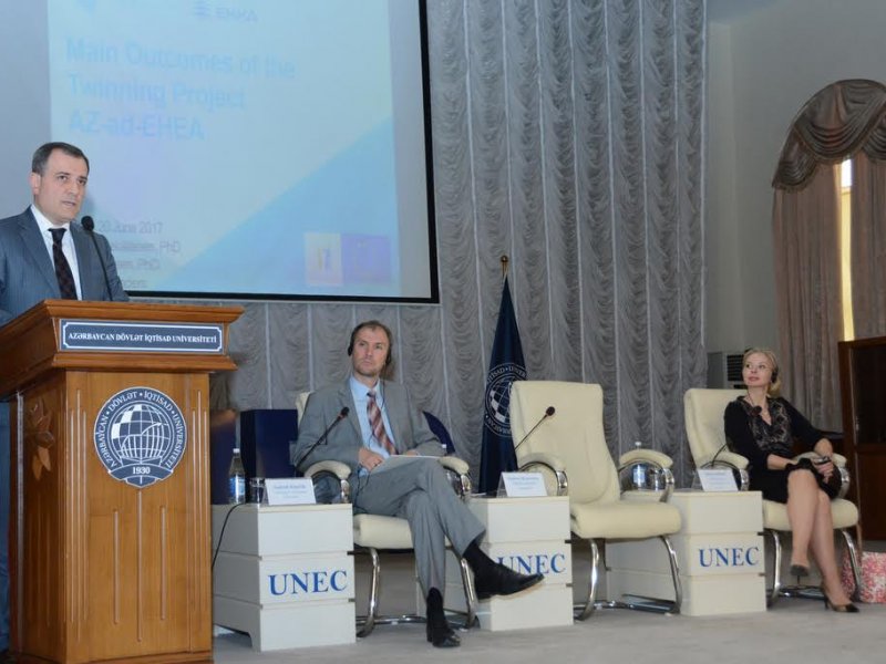 “Azərbaycanda Ali təhsilin keyfiyyətinin yüksəldilməsi” mövzusunda Azərbaycan Dövlət İqtisad Universitetinin konfrans zalında keçirilən konfransın açılış mərasiminə 100-dən çox iştirakçı toplaşmışdı. Nazir müavini Ceyhun Bayramov kürsüyə çıxaraq konfransı açıq elan etdi. Azərbaycanın ən seçilən universitetlərindən olan və konfrans üçün əla məkan təmin edən UNEC layihəmizin fəal iştirakçısı və AzST-nin sınaqdan keçirildiyi pilot universitetlərdən biridir. Avropa İttifaqının Azərbaycandakı nümayəndəliyinin rəhbəri xanım Malena Mard və Estoniyanın müvəqqəti işlər vəkili İnderek Kiverik layihəmizi təriflədilər. Daha sonra söz layihə rəhbərlərinə verildi. Layihəmizin ən böyük tədbiri olan bu konfrans eləcə də 29 avqust tarixində keçiriləcək yekun konfransdan öncəki son tədbir idi.